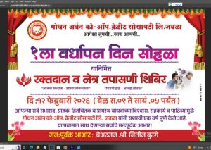 उद्या गुरुवार दिनांक- 12-02-2026 रोजी सकाळी 10.00 वाजता म्हसोबा रोड जवळा येथे गोधन अर्बन को.ऑप.क्रेडिट सोसायटी लि. जवळा या शाखेच्या प्रथम वर्धापन दिनानिमित्त भव्य रक्तदान व मोफत नेत्र तपासणी शिबिर आयोजित केले आहे.